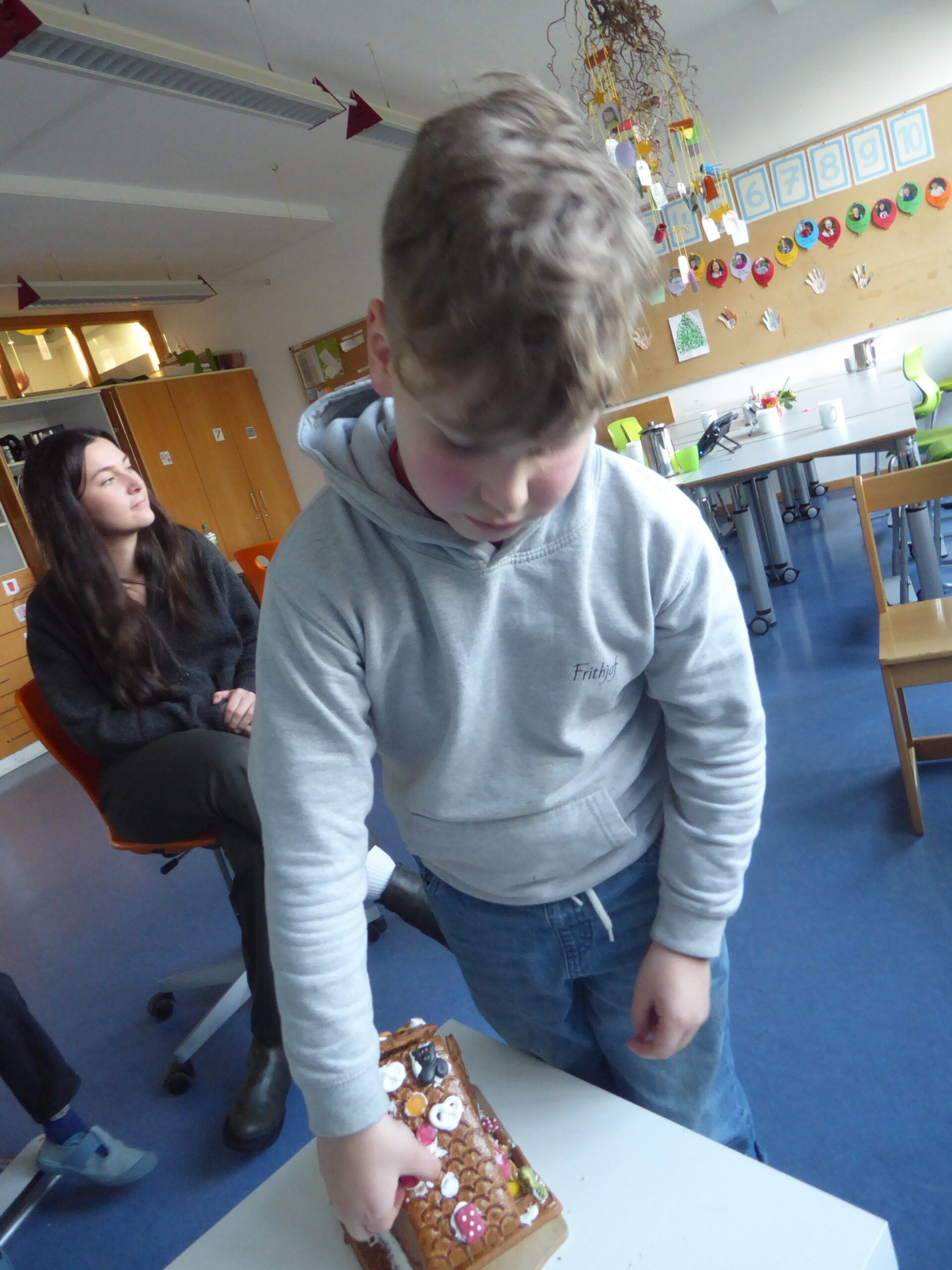 Im Märchenprojekt haben wir vor Weihnachten „Hänsel und Gretel“ gelesen. Zum Abschluss der Reihe hat die U5 ihr eigenes Lebkuchenhaus gestaltet. Jeder durfte etwas Süßes an das Häuschen kleben – Brezeln aus Zucker, Gummibärchen oder einen großen Tannenbaum aus Lebkuchen selbst. Auch die Hexe, Hänsel und Gretel zogen in das Lebkuchenhaus ein und die schwarze Katze setzte sich auf das Dach. Vor den Ferien durften die Schüler*innen dann an dem Häuschen knabbern – so wie auch Hänsel und Gretel das im Märchen getan haben. Das war wirklich lecker 😊
